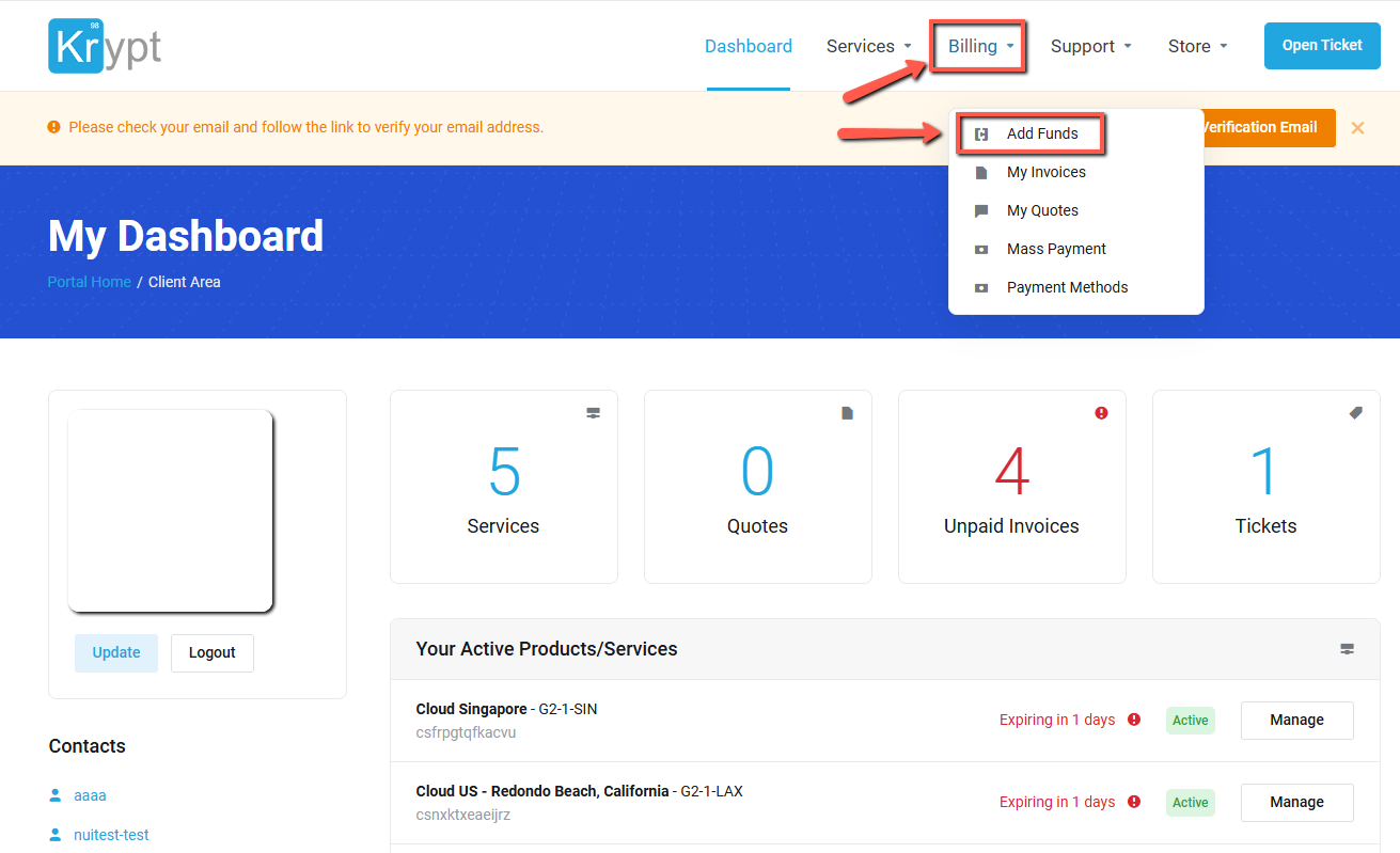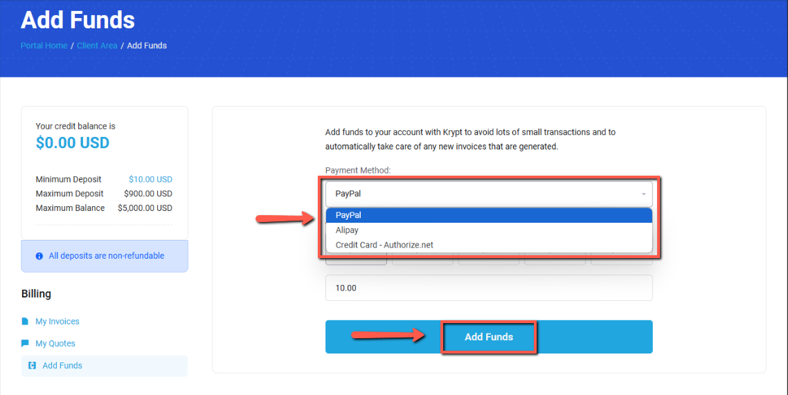 1. Click Tab "Billing " then click "Add Funds"